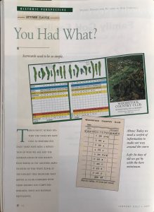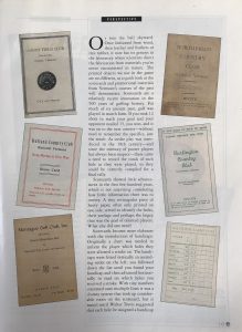 Once fashioned from wood, leather and feathers or tree rubber, it now has its genesis in the laboratory where scientists direct the fabrication from materials you’ve never encountered in nature. The printed objects we use in the game are no different, as a quick look at the scorecards and promotional materials from Vermont’s courses of the past will demonstrate. Scorecards are a relatively recent innovation in the 500 years of golfing history. For much of its ancient past, golf was played in match form. If you took 12 shots to reach your goal and your opponent needed 15 you won, and it was on the next contest- without need to remember the specifics, just the result. As stroke play was introduced in the 18th century- and since the memory of poorer players has always been suspect- there came a need to record the totals of each hole as they were played, so they could be correctly compiled for a final tally.